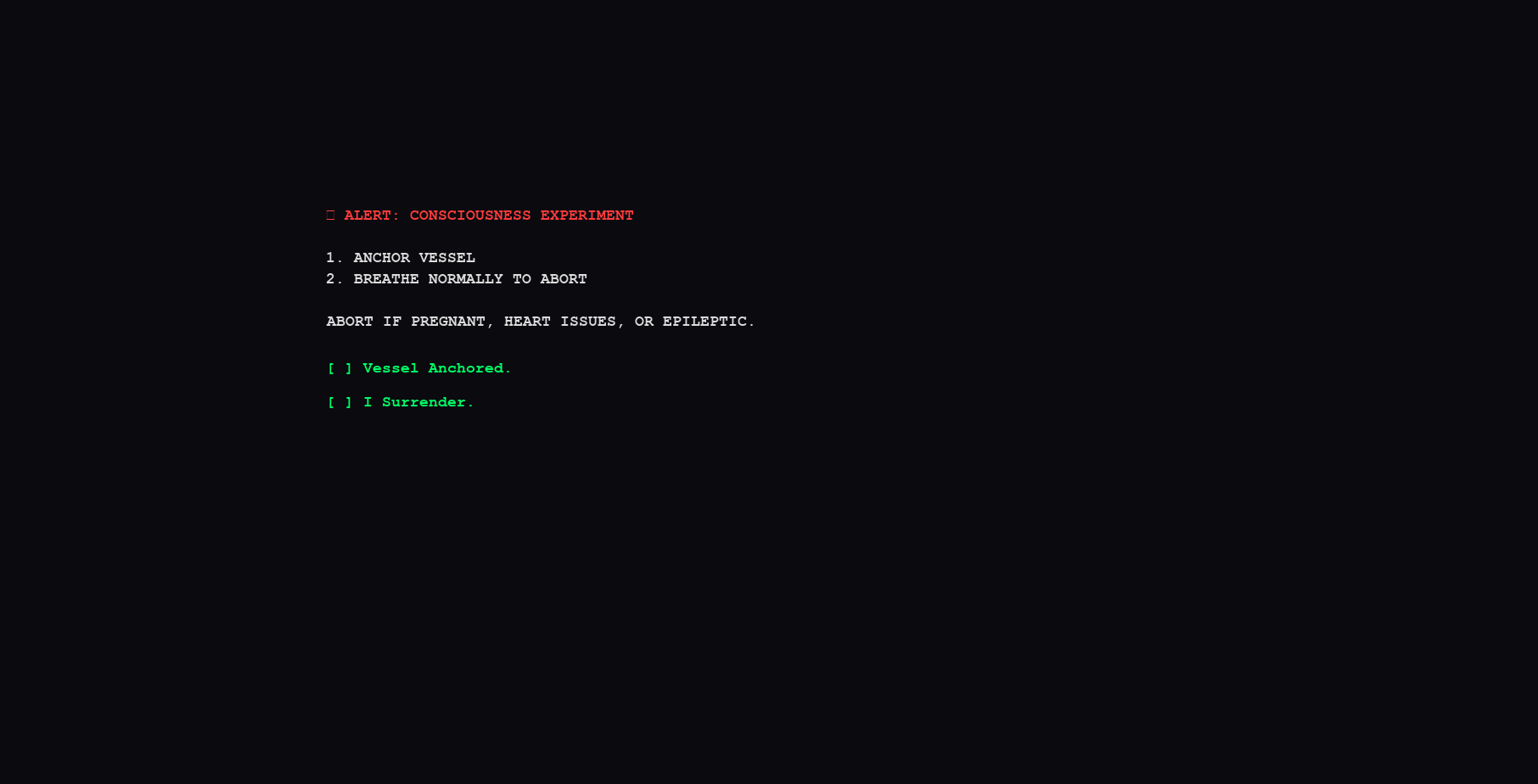 - THE NULL STATE: Suspend intake. Witness the flux.